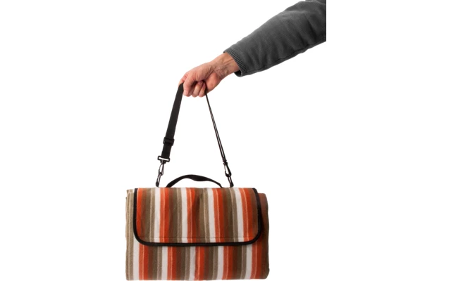 Die Taschen können aber auch einfach untergeschlagen werden oder für die Aufnahme von Zeitschriften oder Kleinmaterial dienen. An den Ecken und in der Mitte der langen Seiten findet man Schlaufen. Damit kann die Decke abgespannt (Heringe sind nicht enthalten) oder sogar notfalls auch als Tarp aufgespannt werden. Zusammengefaltet wird die Decke klein und praktisch mit dem verstellbaren Tragegurt und 2 Karabinern transportiert.