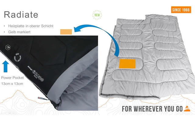 Der innovative Deckenschlafsack Radiate ist mit einer Graphene Heiz Platte im Fußbereich ausgestattet die mittels einer Powerbank beheitzt wird. Dieser einmalige Schlafsack wurde auf der ISPO 2019 mit einem Award ausgezeichnet und ist der perfekte Schlafsack für alle die Abends gerne in einen warmen, vorgheizten Schlafsack „schlüpfen“ wollen.